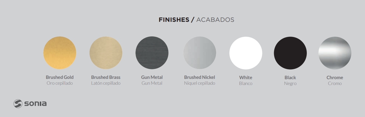 ACABADO en CROMO, BLANCO MATE, NEGRO MATE, ORO CEPILLADO, LATON CEPILLADO, GUN METAL y NIQUEL CEPILLADO