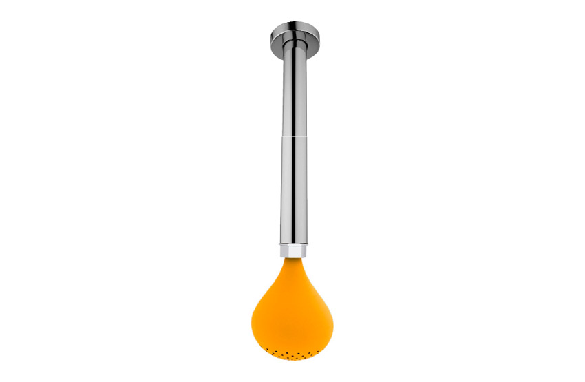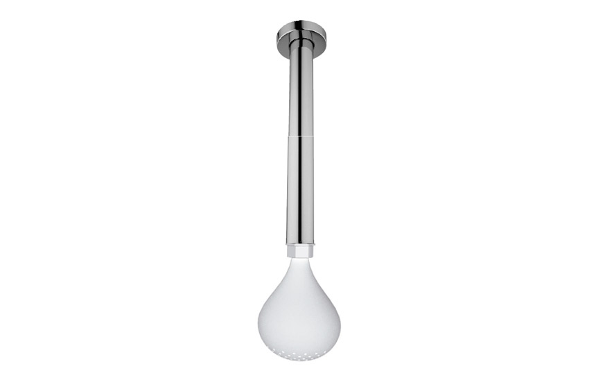 Ducha de silicona Drop con brazo de techo de 30 cm. Dentro de la colección de duchas, sin duda es la más especial tanto a nivel formal ( imita una gota de agua ) como por el material empleado: la silicona , de excelentes propiedades antibacterianas.