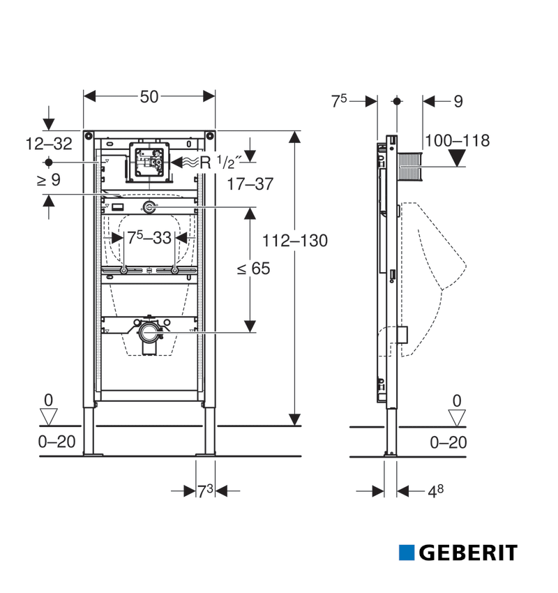 • Altura del bastidor ajustable al urinario, 112–130 cm