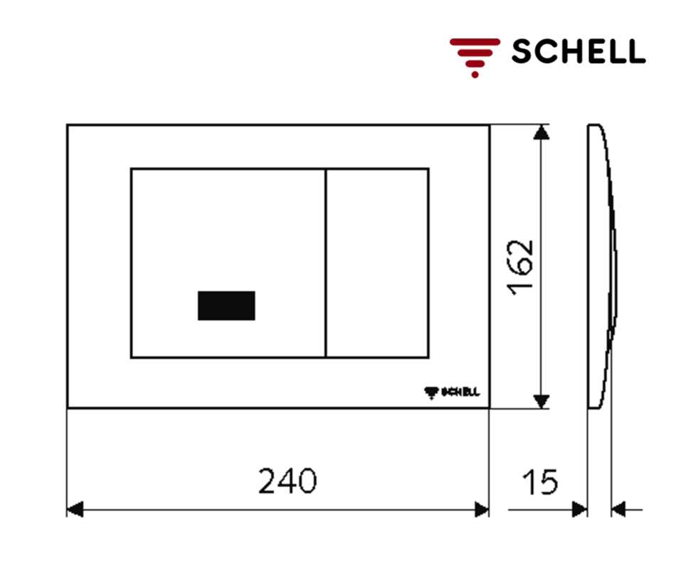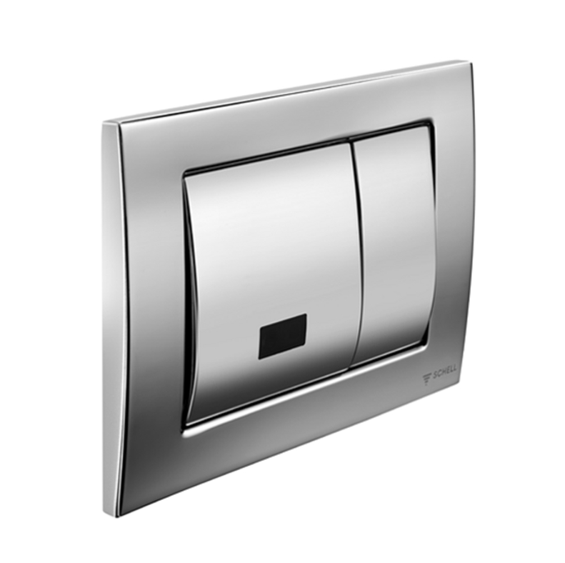 SCHELL escudo FIELD E pulsador metálico doble descarga, dual manual-electrónico, para cisterna empotrada.