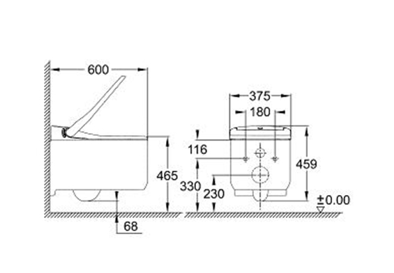 Secador de aire caliente, temperatura ajustable; Absorción de olores; Asiento y tapa Duroplast WC con función automática de apertura y cierre; Sensor infrarojo que identifica la presencia del usuario; Panel de control en el lateral del WC; Luz nocturna en el interior del WC; Conexiones de suministro de agua y electricidad ocultas; Control remoto